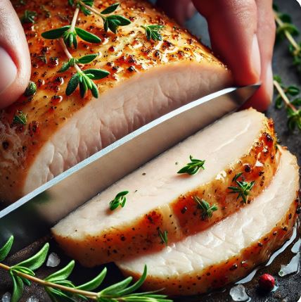 - 완전히 익은 닭가슴살을 5분 정도 휴지시킨 뒤 썰어주세요.